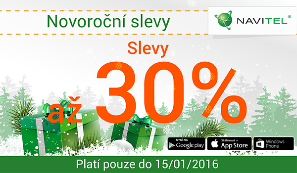 Blíží se svátky a NAVITEL® naděluje „Novoroční slevy”. Pouze do 15. ledna 2016 mají uživatelé iPhone/iPad a zařízení s OS Android a Windows Phone jedinečnou příležitost ke koupi elektronického licenčního klíče k jakémukoli mapovému balíčku se slevou az 30%!