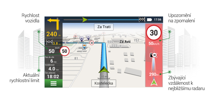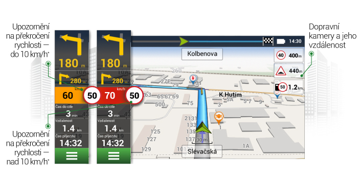 Vylepšené rozhraní pomáhá řidiče upozornit nejen na blížící se dopravní kamery, ale také jejich směr (stejný směr jízdy/v protisměru) a aktuální a maximální povolenou rychlost. Správně načasovaná oznámení navigace Navitel Navigator pomohou řidiči bezpečně upravit rychlost, připravit se na změnu jízdního pruhu či na rizikové silniční úseky (např. na nebezpečné zatáčky, na nečekané přechody pro chodce atd.).