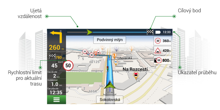 GPS navigace NAVITEL® zobrazují v horní části obrazovky ukazatel průběhu zvolené trasy. Zelený kurzor se posunuje na liště směrem doprava a udává, jaká část trasy již byla ujeta a jaká část zbývá do cíle. Kromě číselného vyjádření zbývajícího času a počtu kilometrů do cíle v navigační liště v levé části obrazovky, má tak řidič k dispozici i tuto přehlednou možnost.