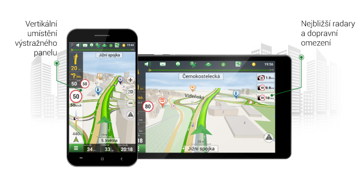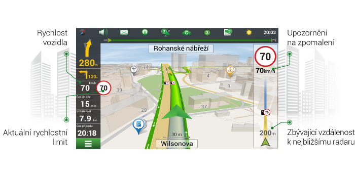 Vylepšené rozhraní pomáhá řidiče upozornit nejen na blížící se dopravní kamery, ale také jejich směr (stejný směr jízdy/v protisměru) a aktuální a maximální povolenou rychlost. Správně načasovaná oznámení navigace Navitel Navigator pomohou řidiči bezpečně upravit rychlost, připravit se na změnu jízdního pruhu či na rizikové silniční úseky (např. na nebezpečné zatáčky, na nečekané přechody pro chodce atd.)