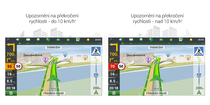 *Výchozí nastavení je překročení o 10 km/h. Chcete-li toto nastavení změnit, přejděte do Menu > Nastavení > Upozornění > Překročení rychlosti.