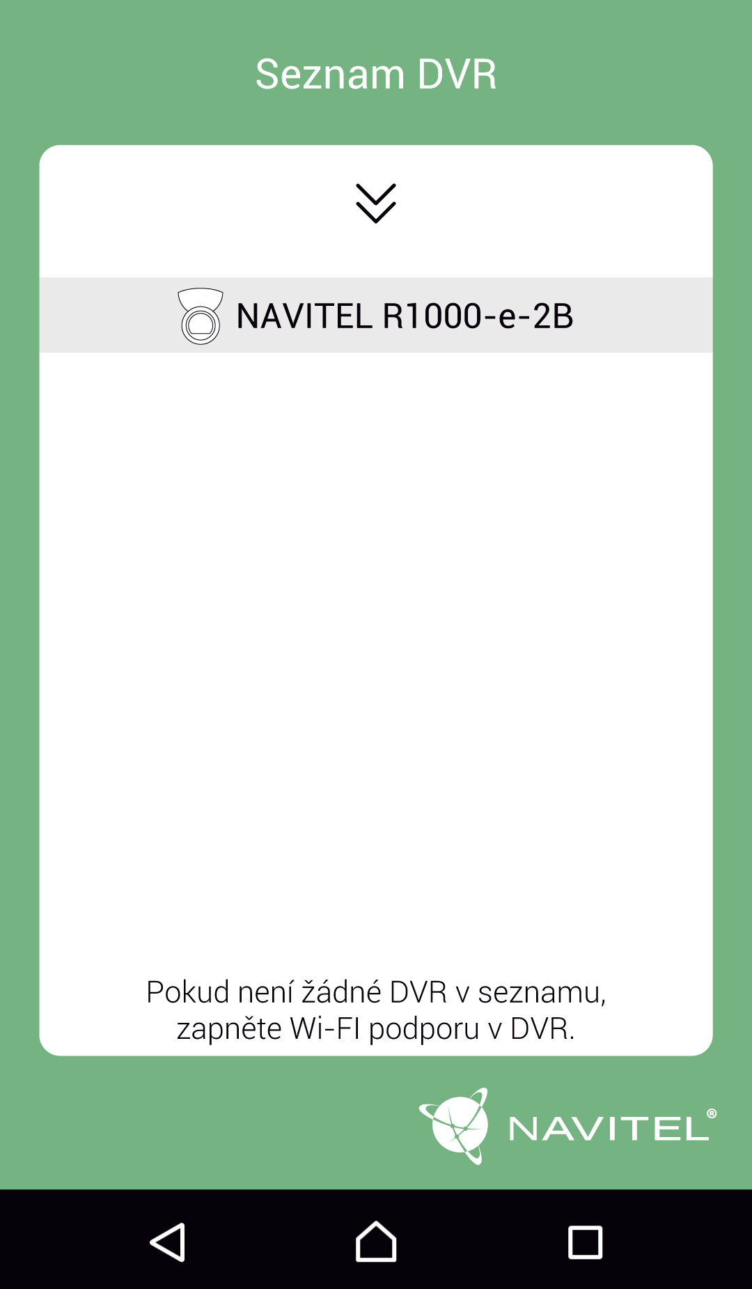 3. Připojte mobilní zařízení k DVR přes Wi-Fi síť. V seznamu dostupných zařízení DVR se Vaše DVR zobrazí jako NAVITEL r1000-e-XX. Pro spárování použijte heslo uvedené v WiFi CARCAM v nabídce Obecného nastavení DVR.