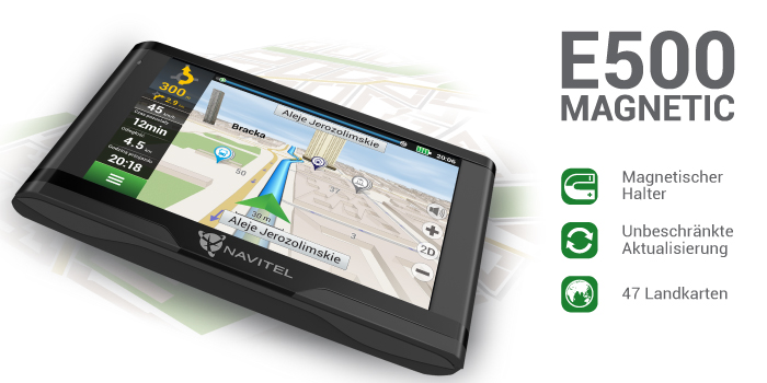 NAVITEL® freut sich, die Einführung des neuen Auto-Navigationsgeräts – "NAVITEL E500 MAGNETIC" anzukündigen. Das Gerät hat einen 5-Zoll-Touchscreen mit einem breiten Blickwinkel. Einer der Hauptvorteile ist der Magnethalter, mit dem das Navigationsgerät einfach installiert und entfernt werden kann. Das Gerät hat zum Gebrauch fertig installierte Landkarten von 43 Ländern Europas, darunter Russland, Weißrussland, Kasachstan und Ukraine.