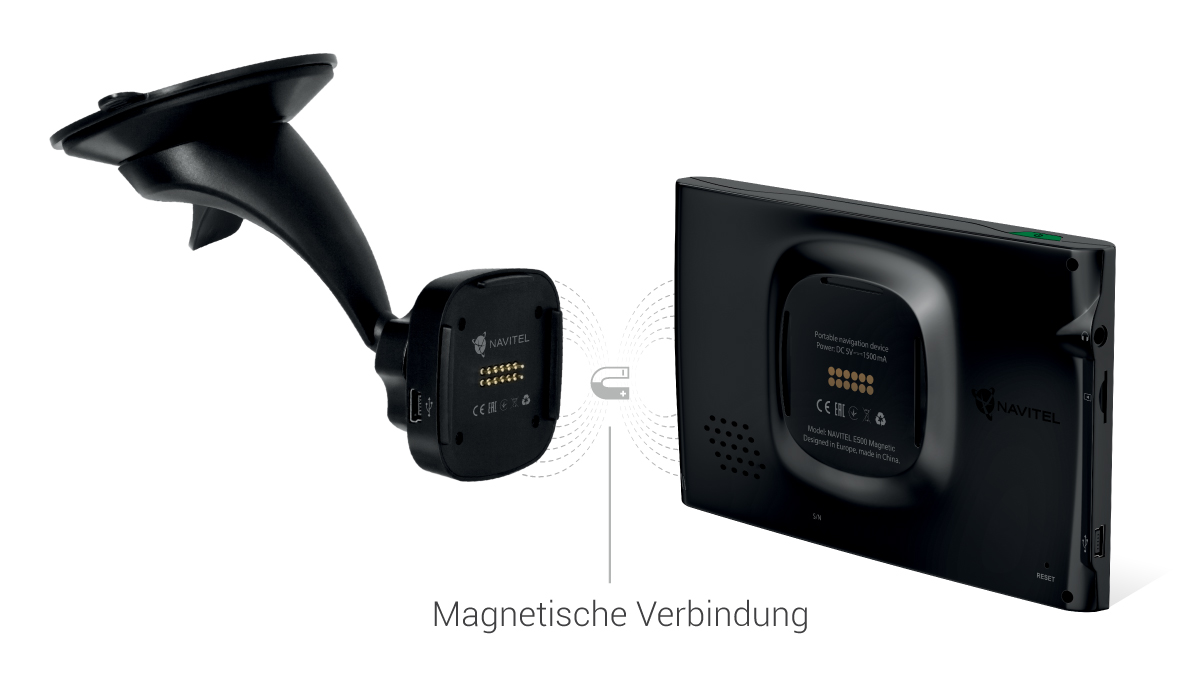 Sobald "NAVITEL E500 MAGNETIC" mit dem Magnethalter verbunden wird, wird das Gerät automatisch gestartet und läßt das Navigationsprogramm an. Das Gerät schaltet sich in 15 Sekunden nach dem Entfernen aus der Halterung aus. Der starke Magnet hält das Gerät während der Fahrt in Position.