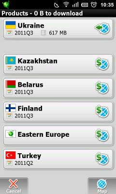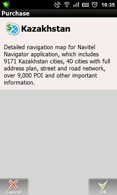 To buy program license, while starting trial version, press button “Purchase” after starting the program and choose program with the package of maps, which you need. You will be forwarded to Android Market page, where you can find detailed product description, its price and make a purchase.