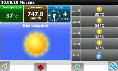 — Добавлен новый виджет Навител.Погода. Благодаря ему не выходя из навигационной программы, при наличии доступа в интернет, вы сможете узнать погоду на ближайшую неделю в любом городе с вашего навигационного устройства! Доступна информация о температуре воздуха, давлении, направлении ветра и облачности. Сервис Навител.Погода — бесплатный. Данные предоставляются gismeteo.ru.