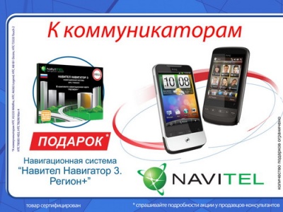 С 1 октября в сети магазинов «Компьютерный Мир» Санкт-Петербурга стартует специальная акция! При покупке смартфонов и коммуникаторов HTC A3333 Wildfire, HTC A6363 Legend, HTC A8181 Desire, HTC T3333 Touch 2, HTC T8585 HD2 и HTC T8290 Max 4G — каждый покупатель получит коробочную версию Навител Регион+ в подарок!