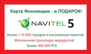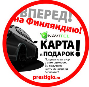 При покупке в магазинах розничных торговых сетей автомобильных навигаторов Prestigio с картой России от Навител и специальным стикером-наклейкой на коробке, пользователь получает в подарок карту Финляндии для Навител СОВЕРШЕННО БЕСПЛАТНО! Подарочная карта уже загружена в навигатор и позволяет без труда прокладывать сквозные маршруты между городами России и Финляндии.
