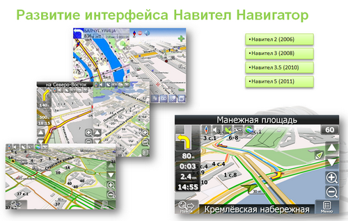 С момента выпуска первых версий Навител Навигатор в 2006 году, с каждым обновлением мы стремимся сделать интерфейс программы проще, понятнее и удобнее для пользователя. На изображении ниже вы можете увидеть, как менялся интерфейс Навител за последние 5 лет.