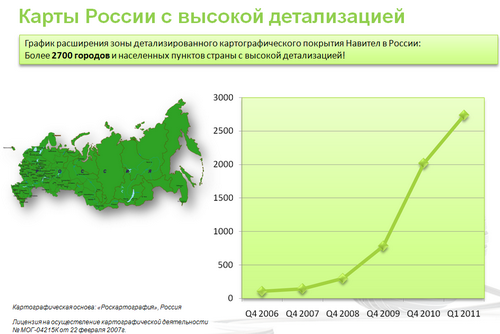 Картография — интереснейшая сфера, требующая тщательного и профессионального подхода. Навител самостоятельно занимается изготовлением навигационных карт. Всего за пять лет нам удалось добиться отличных результатов в этом направлении. За прошедшее время для пользователей Навител в России стала доступна самая подробная и детализированная карта страны, включающая в себя 2 миллиона 900 тысяч километров дорожного графа, более 2700 городов и населенных пунктов с высокой детализацией, 450 тысяч точек POI! И с каждым обновлением карт России для Навител — количество городов и населенных пунктов с максимальной детализацией увеличивается!